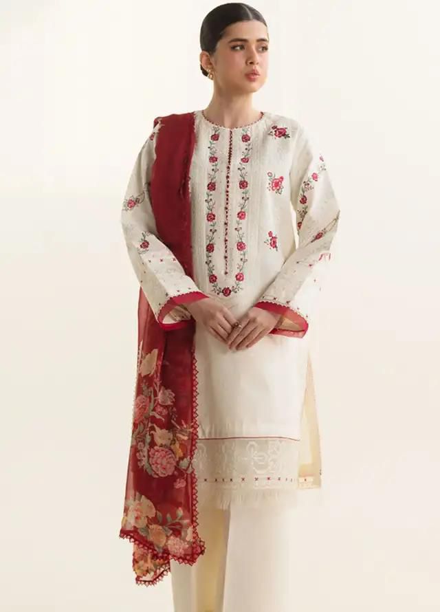 A graceful cream tunic adorned with delicate red floral embroidery, paired with a matching red dupatta. Ideal for a subtle yet elegant style, this outfit combines soft tones with intricate detailing